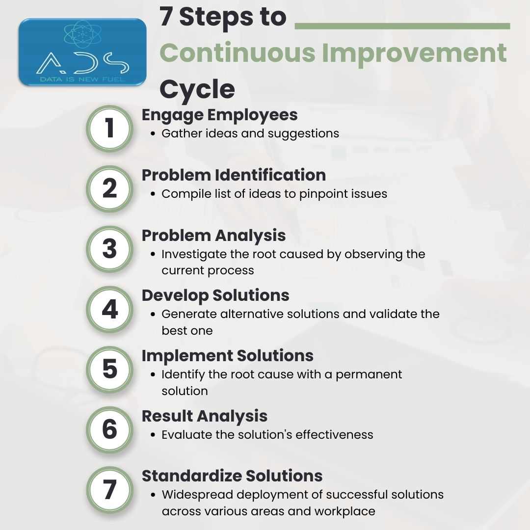 7 Steps to Continuous Improvement Cycle Step 1 : Engage Employees Gather ideas and suggestions Step 2 : Problem Identification Compile list of ideas to pinpoint issues Step 3 : Problem Analysis Investigate the root caused by observing the current process Step 4 : Develop Solutions Generate alternative solutions and validate the best one Step […]