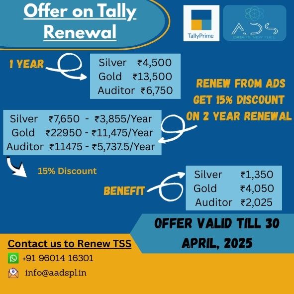 Offer on Tally Renewal 1 Year Silver ₹4,500 Gold ₹13,500 Auditor ₹6,750 Renew from ADS get 15% Discount on 2 Year Renewal Silv ₹7,650 – ₹3,855/Year Gold ₹22950 – ₹11,475/Year Auditor ₹11475 – ₹5,737.5/Year 15% Discount Benefit Silver ₹1,350 Gold ₹4,050 Auditor ₹2,025 Offer Valid till 30 April, 2025 Contact us to renew TSS +91 […]